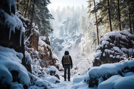 Brave traveller.Hiking backpack on the back of the traveler. Snow forest and rocks. Climbing the mountain in winter. Survival in the wild. high quality photo