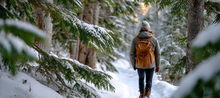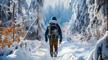 Snowshoe trekker navigating peaceful winter forest background with empty space for text