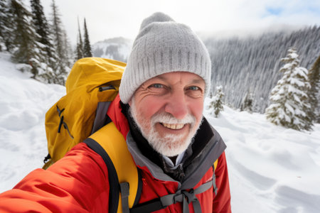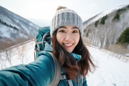 Traveler influencer taking selfie during travel in winter season backpack on alps mountain comeliness