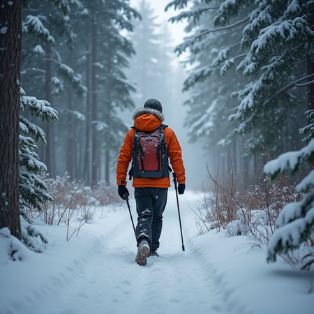 Person walking a path through a snow covered forest, experiencing cold weather adventure