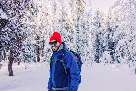 Smiling and happy traveler with hiking backpack on his back. Snowy forest and rocks. Climbing the mountain in winter. Survival in the wild. High quality photo