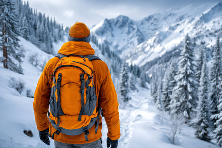 Generative AI, backpacker in winter landscape, traveler man tourist with backpack hiking in mountains