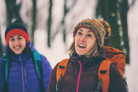 travel with a backpack in the woods in winter in the snow. two girls walk through the forest and laugh. conversation between two friends.