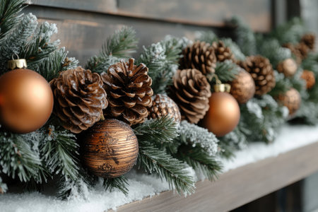 A beautiful winter arrangement showcasing pine cones, delicate ornaments, and soft greenery atop a rustic wood background, perfect for holiday decor and seasonal celebrations.