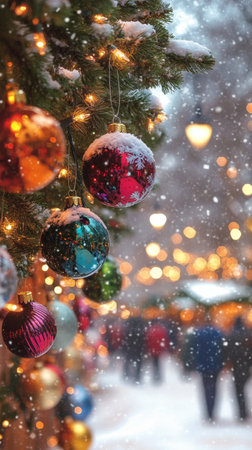 A charming winter street is filled with vibrant ornaments hanging from snowy branches. Snowflakes fall softly as people stroll along, enjoying the festive atmosphere and holiday lights.