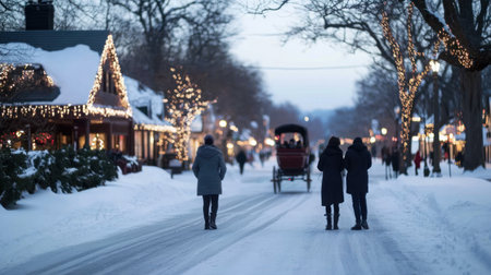 A charming street scene covered in snow, illuminated by warm Christmas lights and garlands, with silhouetted figures...