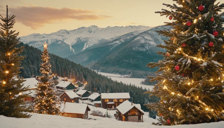 A serene winter scene a small village nestled in a snowy mountain valley. Illuminated Christmas trees, one with a star on dot the landscape. Wooden cabins with warm lights emanating from windows are scattered throughout the village. Snow covers the ground and the roofs of the houses. In the background, snow-capped mountains rise against a twilight sky with soft orange and yellow hues. A frozen lake or river is visible in the distance, surrounded by dense pine forests.