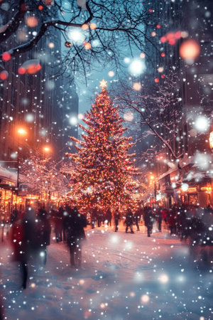 Christmas tree outdoor with snow, lights bokeh around, and snow falling, Christmas atmosphere. Happy New Year