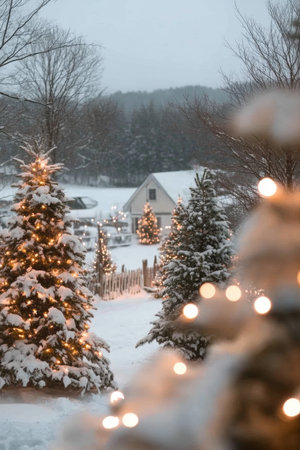Festive winter scene with lights and snow.
