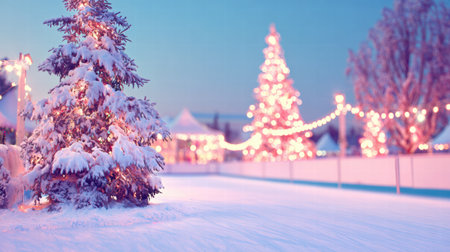 Soft glowing Christmas lights blur behind the ice rink creating warm festive charm