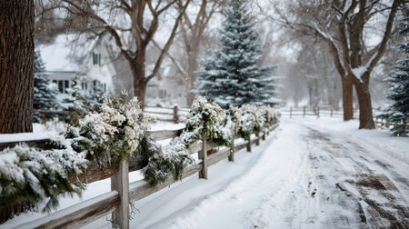 A picturesque winter scene featuring a wooden fence adorned with snowy greenery and twinkling lights, capturing the essence of tranquil holiday charm.