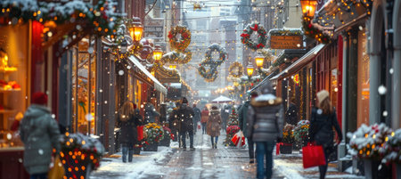 Bustling winter street scene during a vibrant holiday festival. shoppers with colorful bags explore festively decorated shops adorned with wreaths and fairy lights, as gentle snowfall adds to the seasonal charm and warmth.