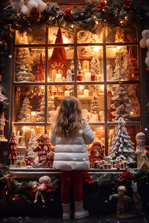 A young girl gazes at the window display of a Christmas toy store