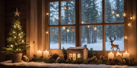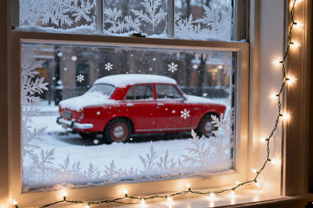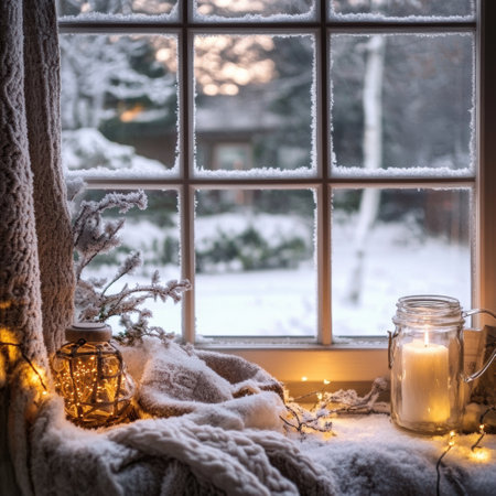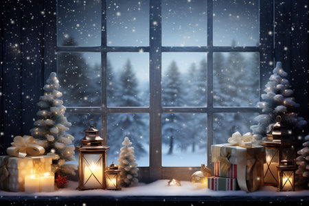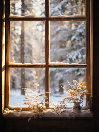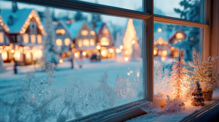 Cozy winter scene with frosted window snowy landscape and festive decorations