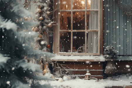 Christmas tree in the window of a house with snow and bokeh