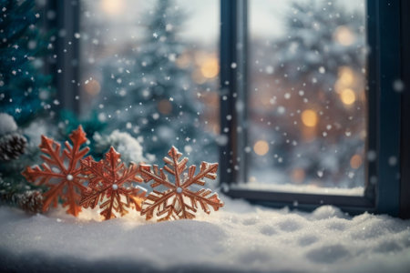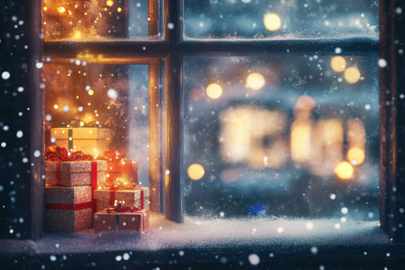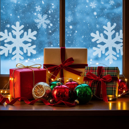 Christmas presents and decorations on the windowsill with snowflakes background