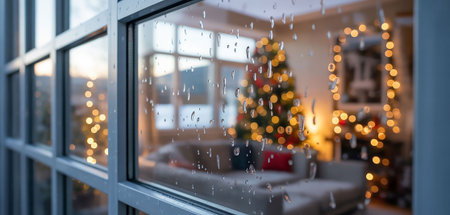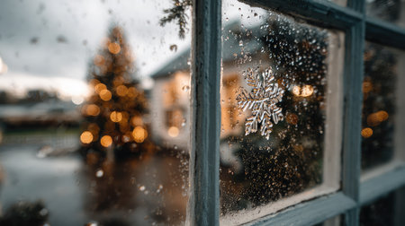 This enchanting winter scene captures a delicate snowflake on a rain-soaked window, while a beautifully decorated tree glows in the cozy background, creating a warm atmosphere.