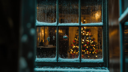 A serene Christmas atmosphere captured through a snowy window, revealing a decorated tree and warm lights in a cozy living room setting.