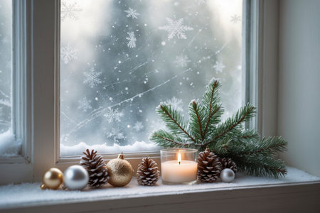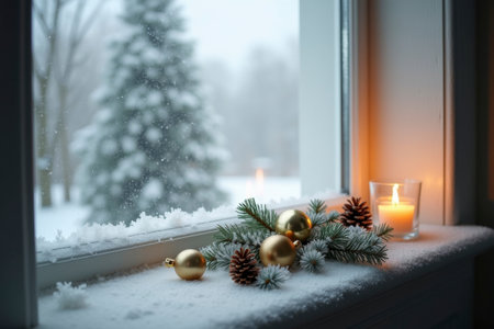 A festively decorated windowsill with a burning candle, pine branches, golden ornaments, and a pinecone. Through the window, snow-covered trees can be seen while gentle snowflakes fall, creating a peaceful winter atmosphere.