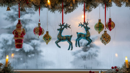 Snowy window with festive Christmas decorations