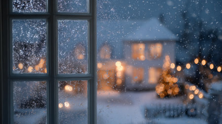 A picturesque view through a window showcasing a snowy winter scene, with warm lights illuminating a cozy home and festive decorations outside.