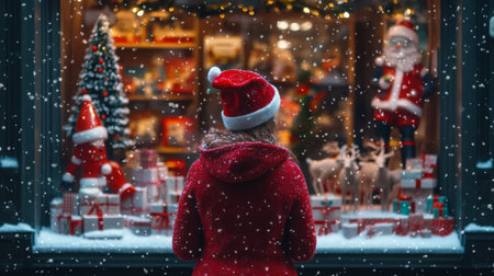 A young woman admires festive Christmas display in a snowy town during the holiday season
