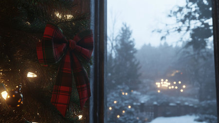 Cozy holiday scene with decorated Christmas tree and snowy outdoors at dusk