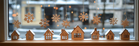 Charming winter window scene with miniature wooden houses and hanging snowflakes. Cozy and festive holiday decor.