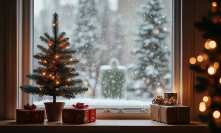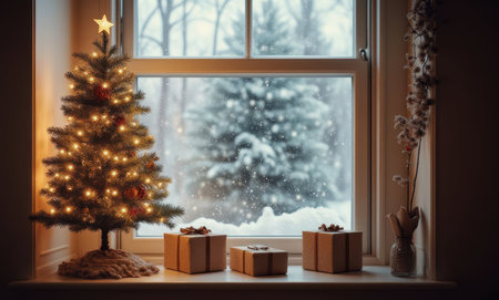 Warm Christmas tree and gifts in a snowy window