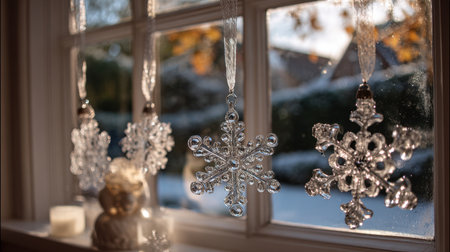 Delicate crystal snowflakes dangle from a window, illuminated by soft sunlight, creating a serene and festive atmosphere in a cozy indoor space during winter.