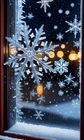 A beautiful view of a snowy winter scene from a cozy window, with delicate frost patterns on the glass and snowflake with warm lights in the background.