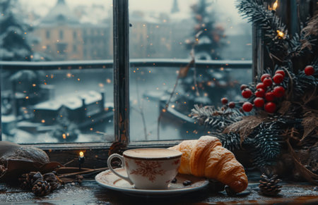 A cozy winter evening with snowfall viewed from warm cafe window during the holiday season