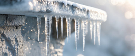 Beautiful huge icicles hanging from the roof of a house, glistening under the soft winter light. These natural ice formations create a stunning and magical winter scene, perfect for capturing the essence of the season.