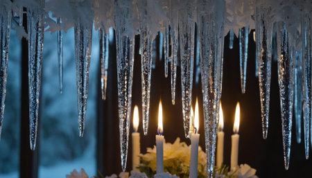 Ornate icicles hang above lit white candles and a floral arrangement, creating a festive and tranquil winter ambiance.