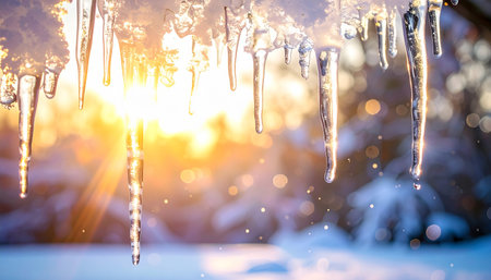 Captivating image of icicles hanging from a roof, illuminated by warm sunset light. The scene captures winter beauty with sparkling droplets and soft ambiance.