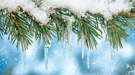 Snow-covered pine branch with icicles hanging, cold winter background, generative ai