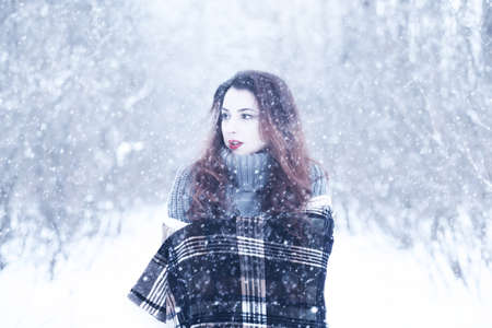 Portrait of a beautiful young woman in a winter park with falling snow.