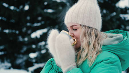 A cute caucasian girl in warm clothes drinks hot tea from a mug while walking in a snowy city park.