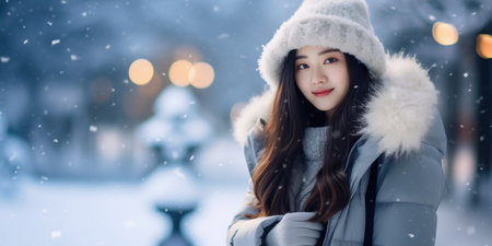 Generative AI Image of Asian Girl Wearing Warm Clothes in Field in Snow Winter Season
