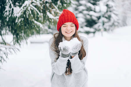 Winter. Woman with red hair wearing ear muffs blowing on snow in hands