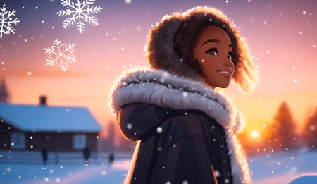 A young woman wearing a yellow knit hat stands in a snowy landscape. Flakes fall gently, creating a serene atmosphere as she gazes thoughtfully into the distance.