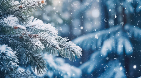 This image showcases frosted tree branches set against a diffused backdrop of falling snow. The composition highlights delicate textures, with a dominant cool color palette creating a wintry atmosphere. It might be used for seasonal themes, nature illustrations, or graphic design projects, suitable for various editorial and commercial applications.