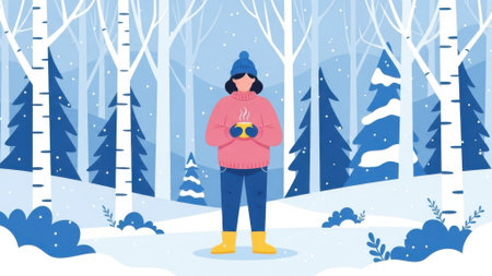 Illustration of a woman in a pink sweater and blue jeans standing in a snowy forest