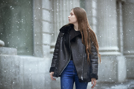 Beautiful modern girl with long brown hair dressed in a leather jacket and jeans walks on the street on an overcast, snowy winter day. People and life.