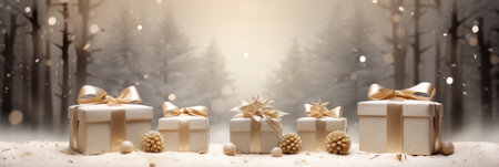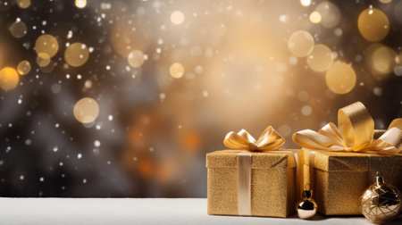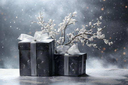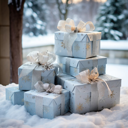 Elegant wrapped presents sit atop a snowy surface, surrounded by a serene winter atmosphere, complete with falling snowflakes and sparkling lights, perfect for celebrating the New Year.