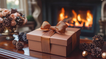A brown gift box with a luxurious gold ribbon, placed on a table near a cozy fireplace, surrounded by holiday decor.