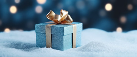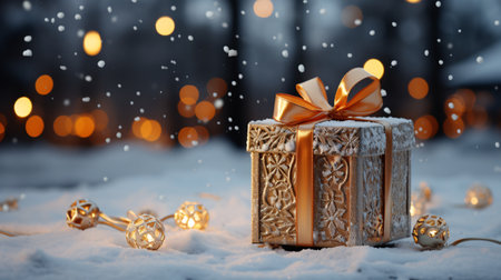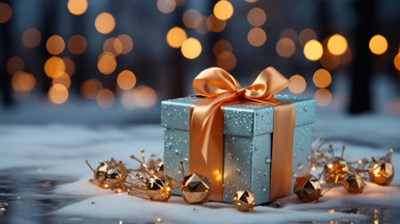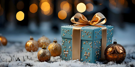 A beautifully wrapped teal gift box with a golden bow sits amidst golden ornaments on snowy ground. Festive lights blur in the background.