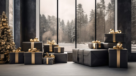 Elegant Black and Gold Christmas Presents, Pine Branches and Golden Christmas Decorations