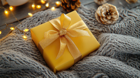 Gift box with a golden ribbon, set in a cozy winter scene with branches, fairy lights, and a soft blanket background