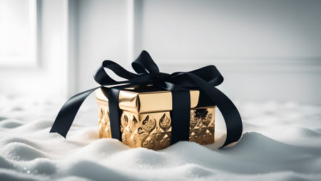 Luxury gold gift box with intricate black ribbon bow in snowy setting. Christmas design for greeting cards and prints